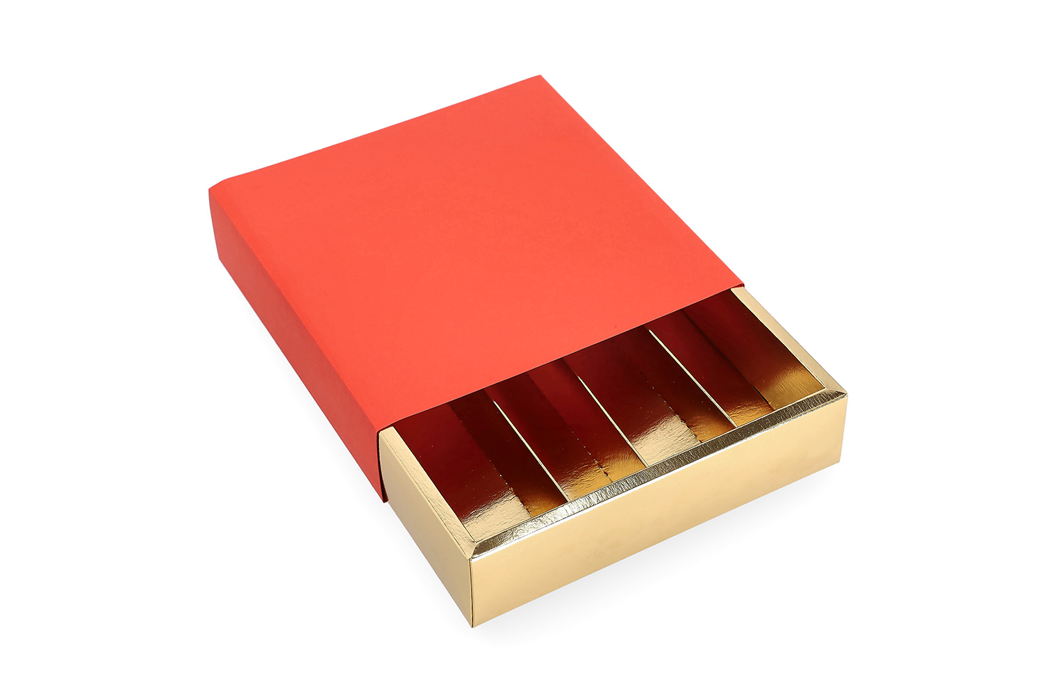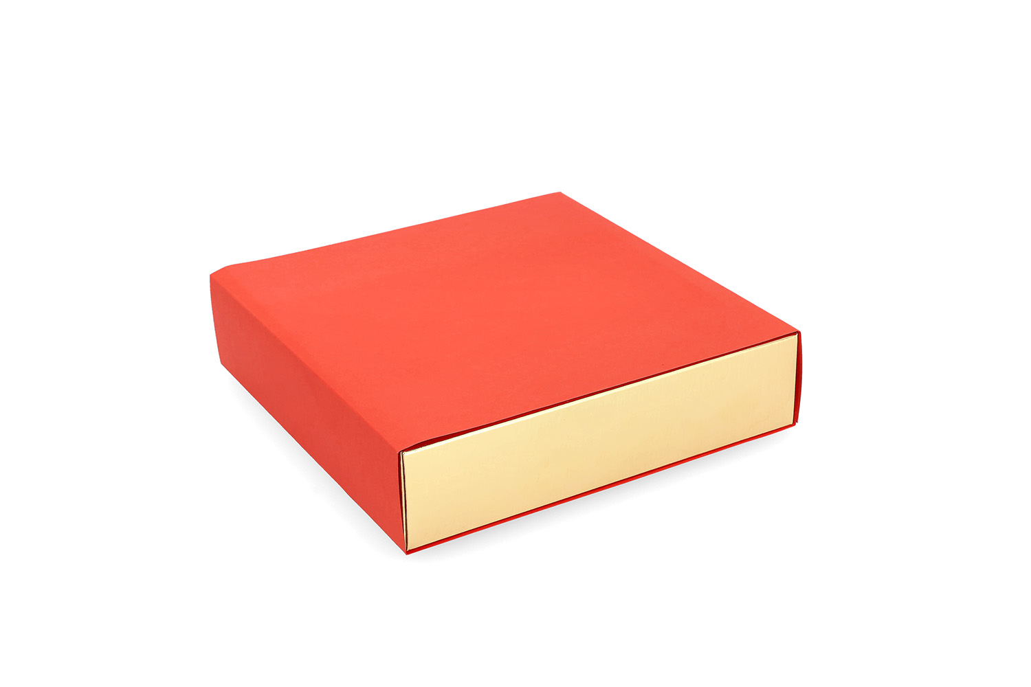 Iekšpuse izgatavota no zelta folijas pārklāta kartona, kas piešķir kastītei spožumu un eleganci. Šī virsma ne tikai izskatās iespaidīgi, bet arī izceļ iepakoto gardumu krāsas. Ārējais apvalks izgatavots no 250 g/m² sarkana kartona, kura dziļais tonis lieliski saskan ar zelta iekšpusi, radot svinīgu un greznu koptēlu.