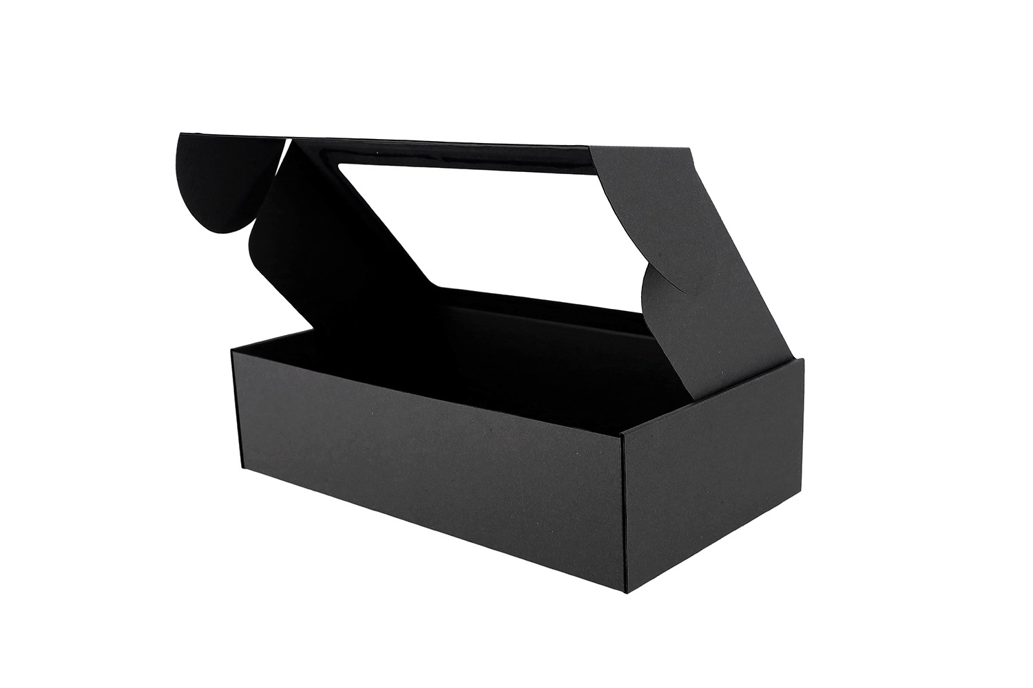 Izgatavota no melnā E tipa gofrētā kartona, kura biezums ir apmēram 1,5–1,8 mm. Konstrukcija balstīta uz FEFCO 0427 dizaina – ātras salikšanas kaste ar integrētu pamatni un ērti aizveramu vāku, kuru var salikt bez papildu līdzekļiem.