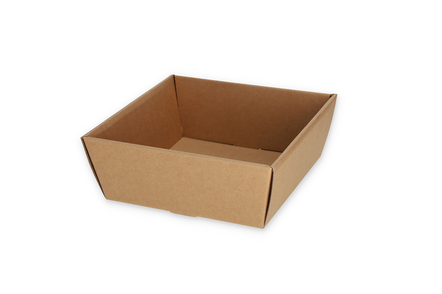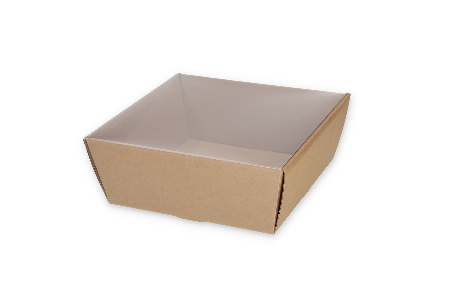 Divdaļīga konstrukcija, kas paredzēta stilīgai un ērtai dāvanu komplektu iesaiņošanai. Apakšējā daļa izgatavota no brūna E viļņa gofrētā kartona, kas nodrošina izturību un stabilitāti, bet augšējā daļa – no caurspīdīga PVC plastmasas, kas ļauj skaidri redzēt kastes saturu.