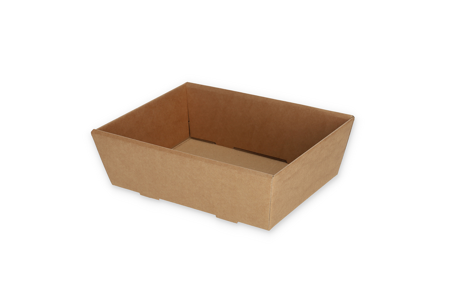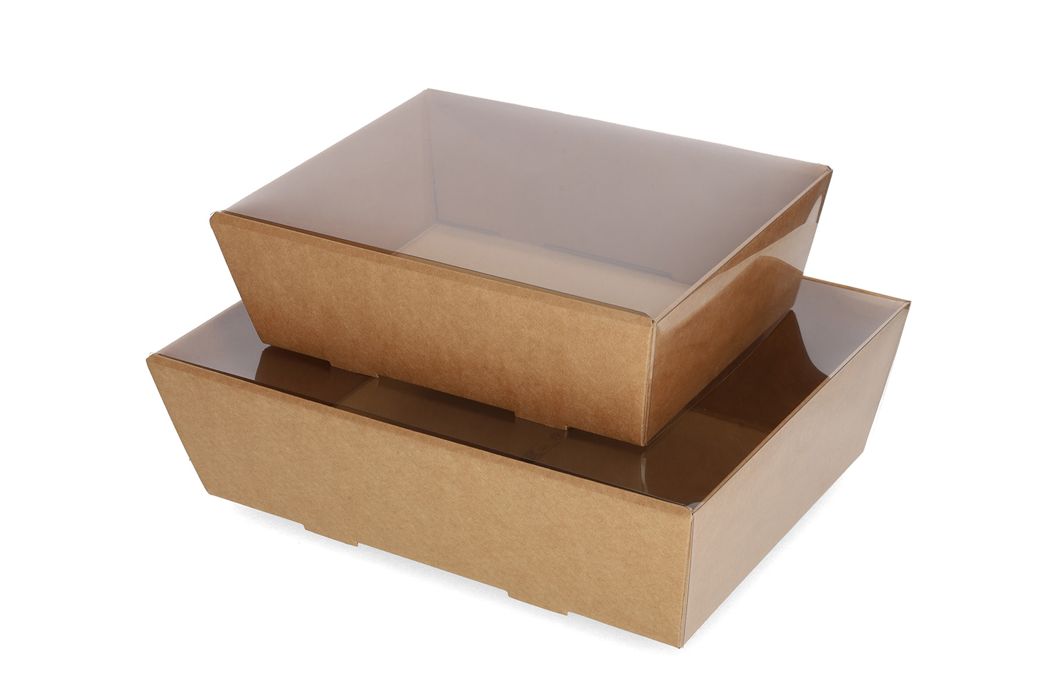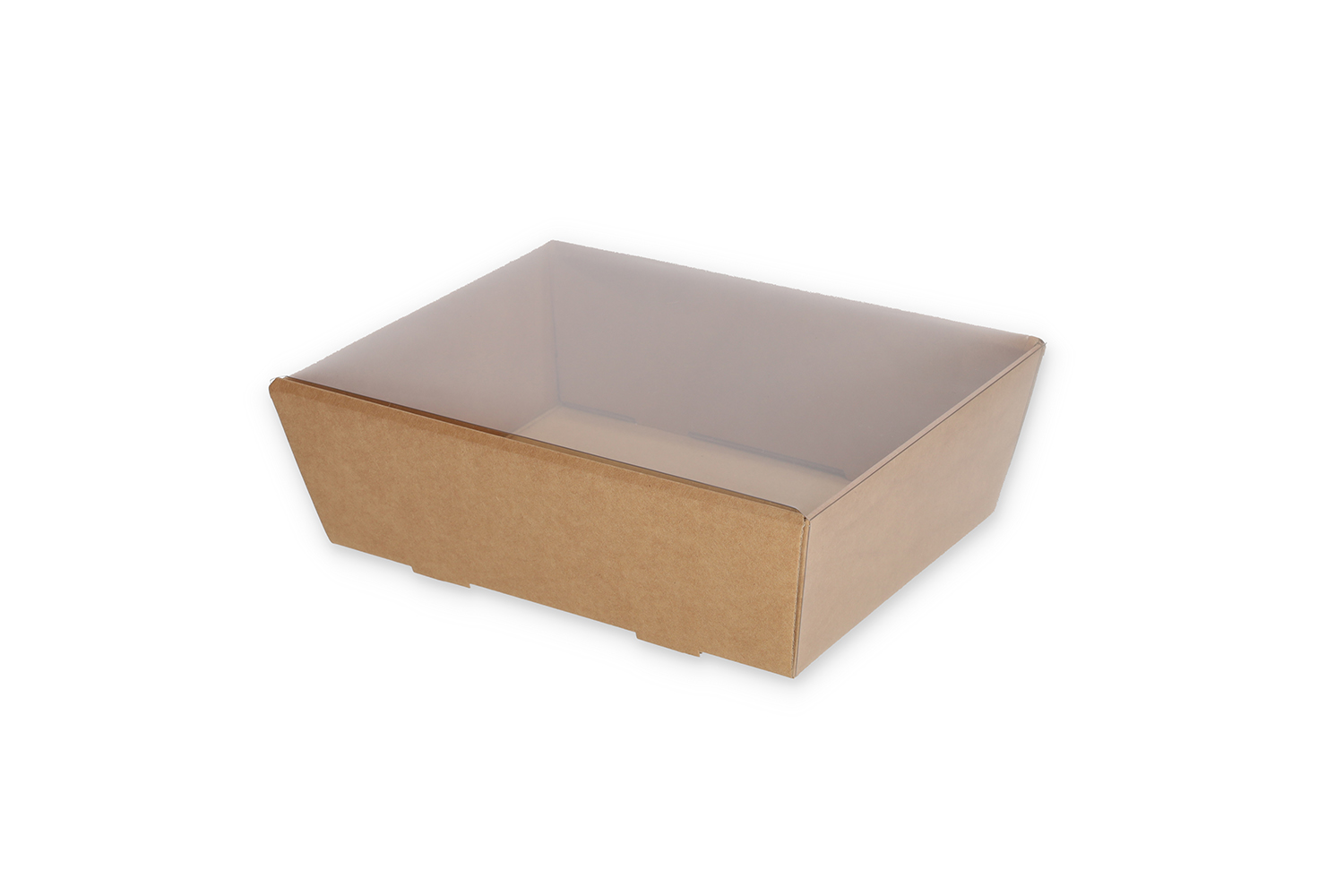 Divdaļīga konstrukcija, kas paredzēta stilīgai un ērtai dāvanu komplektu iesaiņošanai. Apakšējā daļa izgatavota no brūna E viļņa gofrētā kartona, kas nodrošina izturību un stabilitāti, bet augšējā daļa – no caurspīdīga PVC plastmasas, kas ļauj skaidri redzēt kastes saturu.