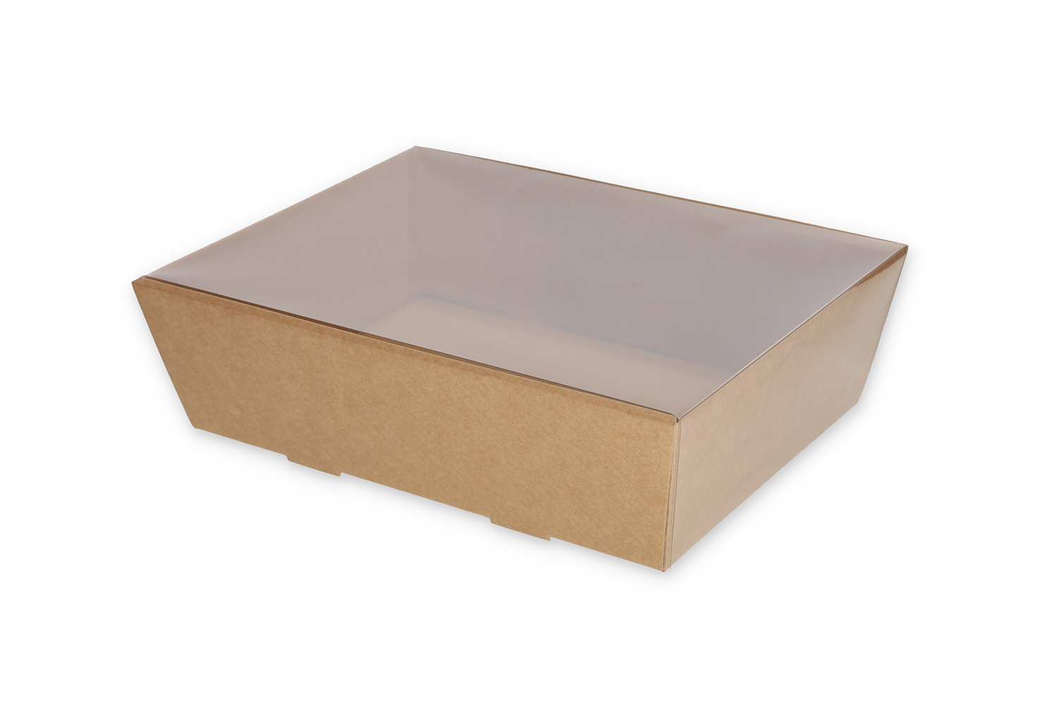 Divdaļīga konstrukcija, kas paredzēta stilīgai un ērtai dāvanu komplektu iesaiņošanai. Apakšējā daļa izgatavota no brūna E viļņa gofrētā kartona, kas nodrošina izturību un stabilitāti, bet augšējā daļa – no caurspīdīga PVC plastmasas, kas ļauj skaidri redzēt kastes saturu.